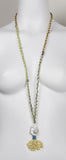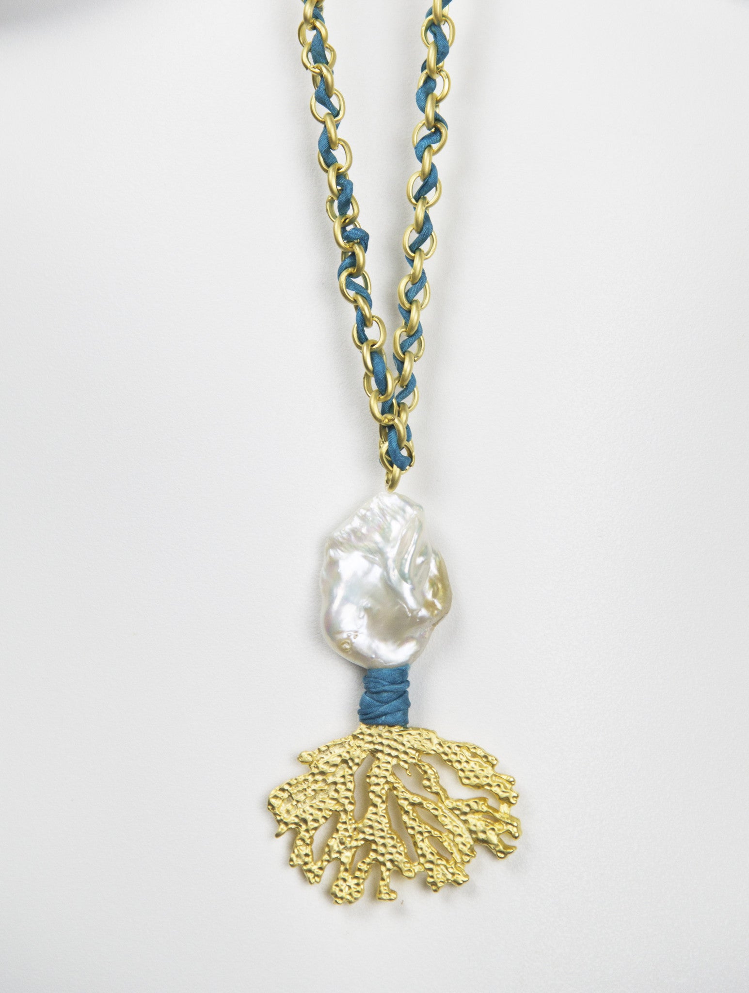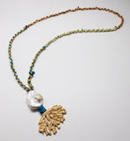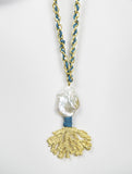 Gold plated coral finding is anchored on a 16k gold-plated Turkish chain hand-woven with signature Sam DuPont hand-dyed Thai silk. This long pendant is embellished with a giant baroque fresh water pearl wrapped in silk and sealed with a signature gold kiss. Allow 1-2 weeks delivery.