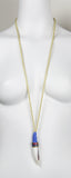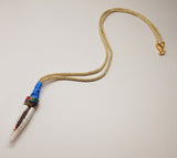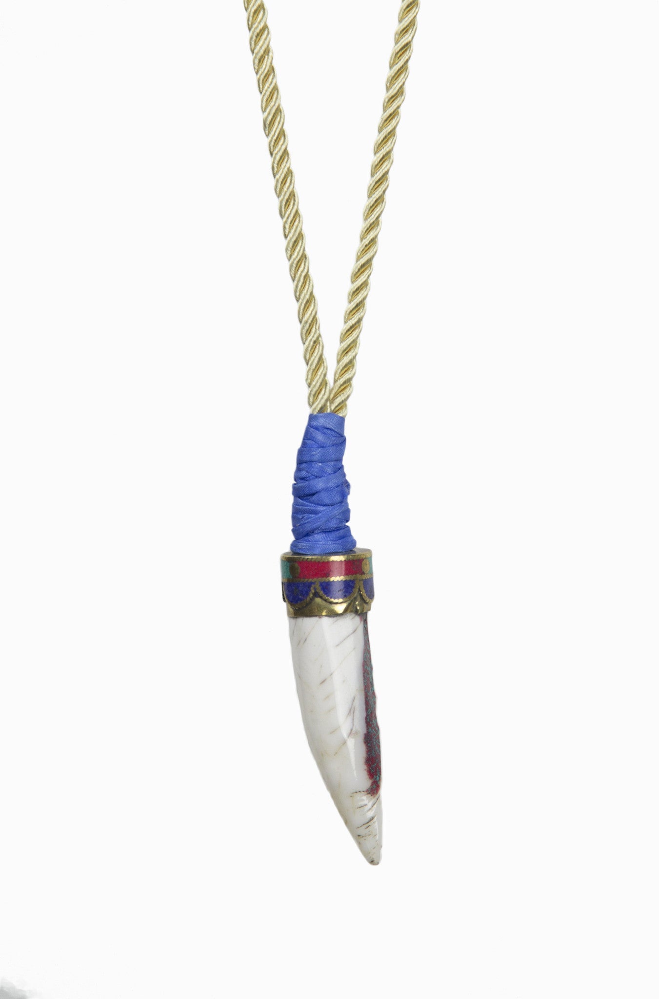 Tibetan horn with cloissonne cap is anchored on an ivory-champagne silk Turkish rope and wrapped and hand-knotted in signature Sam DuPont cornflower blue Thai silk. Sealed with a signature gold kiss.