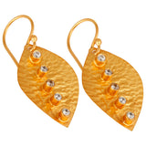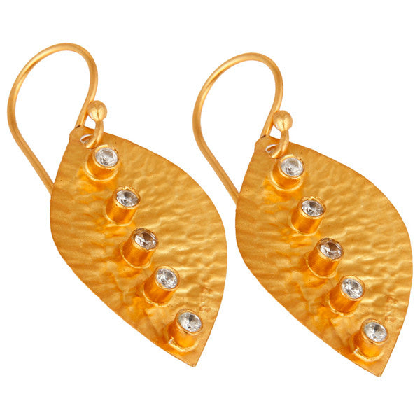 Feather-weight 24 karat gold vermeil leaf drops are perfectly adorned with a simple stripe of five semi-precious bezelled clear cz. These delicatee little charmers are a miniature take on our popular Eva ear are the perfect price & size for gift giving. French hooks. Parisian-Flea must haves. Pairs well with fine & designer jewelry.