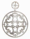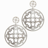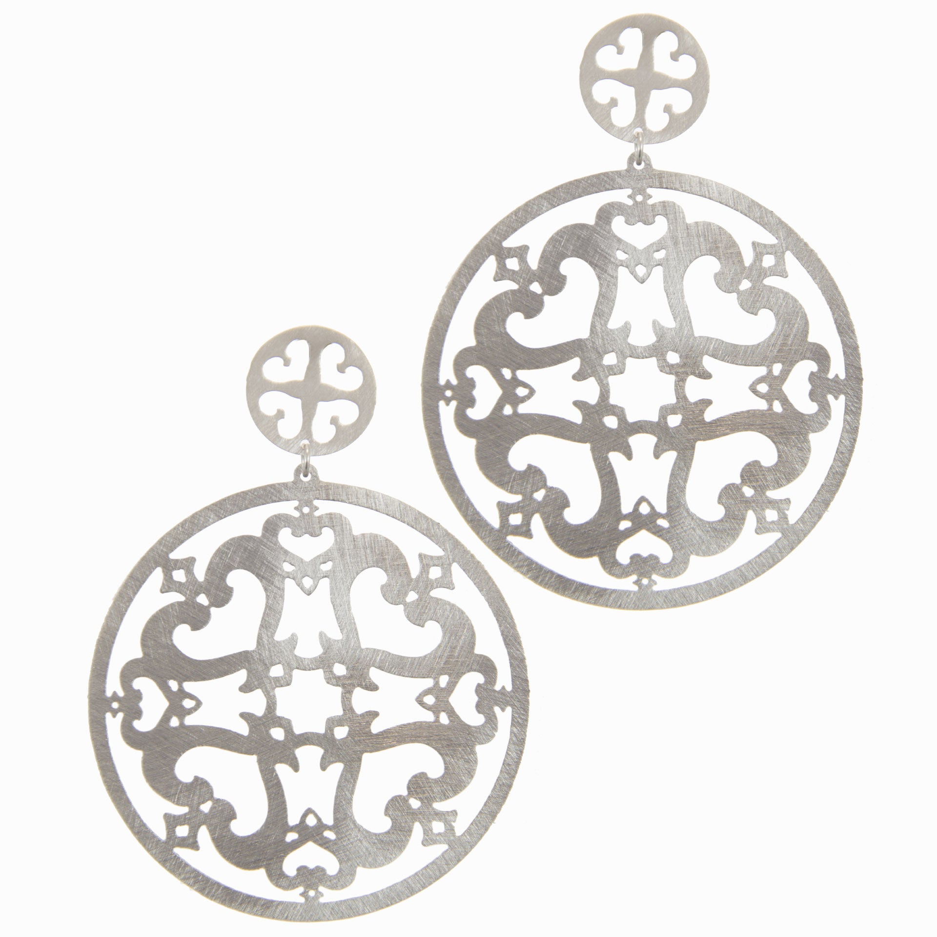Perfect rounds of galvanized sterling silver are laser cut  by hand into and intricate repetitive pattern of Gothic hearts. Light-weight, modern and fresh.