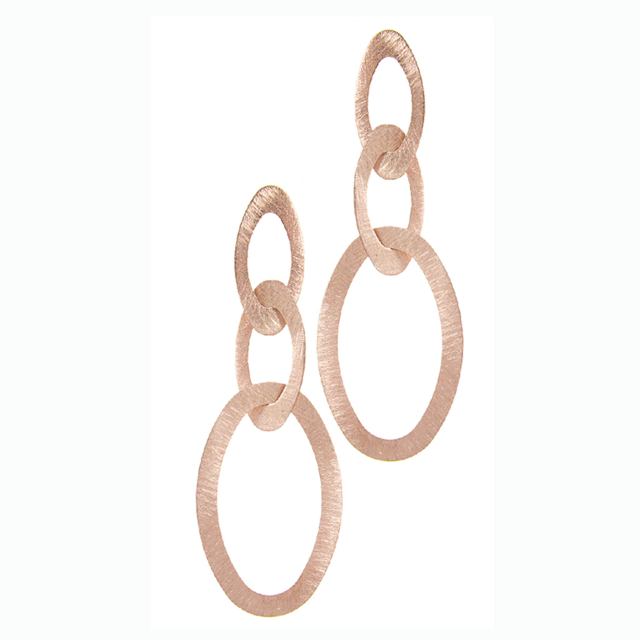 Three crisp ovals laser cut by hand from galvanized brass plated in rose gold are seamlessly linked together to create a perfect balance of glamour and simplicity. Light-weight on posts, modern and fresh.