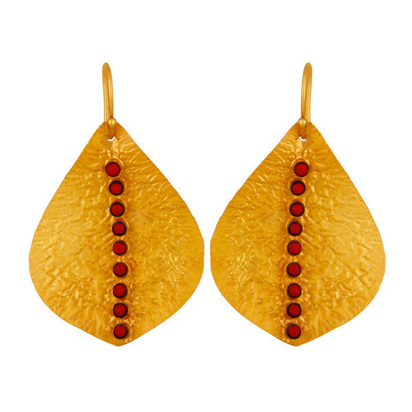 Feather-weight 24 karat gold vermeil leaf drops are perfectly adorned with a simple stripe of semi-precious bezelled organic turquoise stones. French hooks. Parisian-Flea must haves.