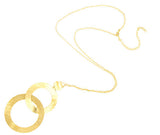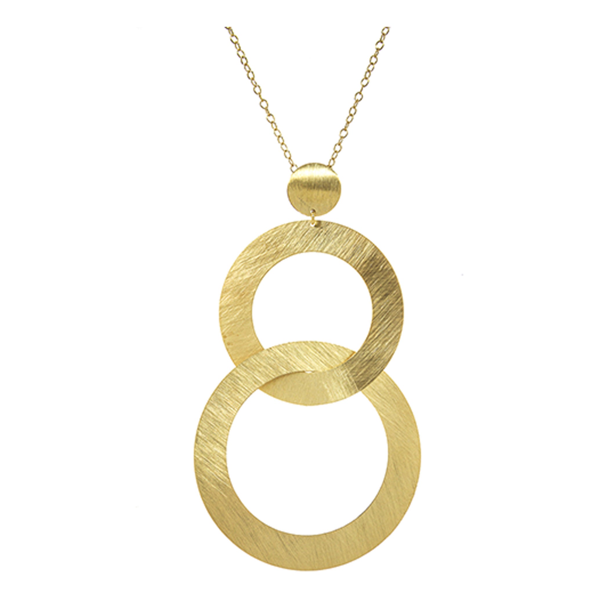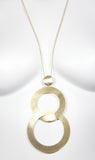 Large flat Architectural links of galvanized brass are hand cut by laser and seamlessly linked together on a delicate long chain. Pendant drapes the body for a modern look that elongates the body and makes a clean statement.