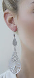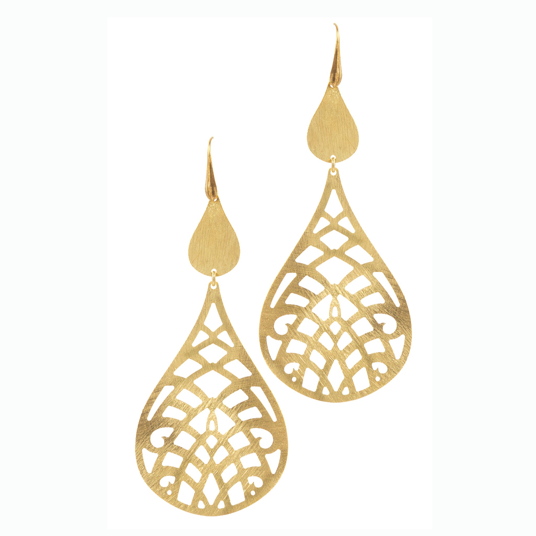 Clean & sharp filigree patterns are laser cut by hand from sanded sheets of galvanized brass. These artfully carved components are linked together for perfect movement and drape. These pieces are modern without sacrificing femininity. A unique and signature set of earrings that are worthy of the runway. Articulated French hooks.