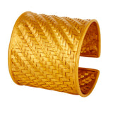 This architecturally-inspired 24 karat gold vermeil cuff is meticulously constructed by hand from hammered strips of sterling silver that are plated in the priceless glow of 24 karat Indian gold, and then woven into a cuff in a perfect French Colonial rattan pattern that represents one of our most coveted signature pieces from the Sam DuPont collection. Representative of our signature rattan medallion logo this piece is a classic, designer quality collector's piece. Cuff is very pliable, yet extremely delicate due to the softness of the precious metals, which provide for a flawless, sexy, painted on fit. Handle with care.