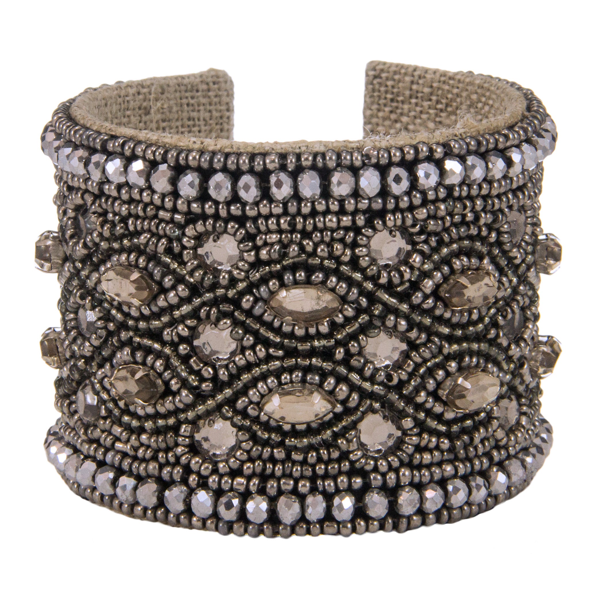 Signature hand-crafted Devi Cuff by Sam Dupont. Adorned with intricate patterns of colorful glass beads, all cuffs are moldable for an effortless and elegant fit. Natural linen lining adds style and comfort. Pop a simple white shirt and jeans or add a flash of color to a simple sheath.