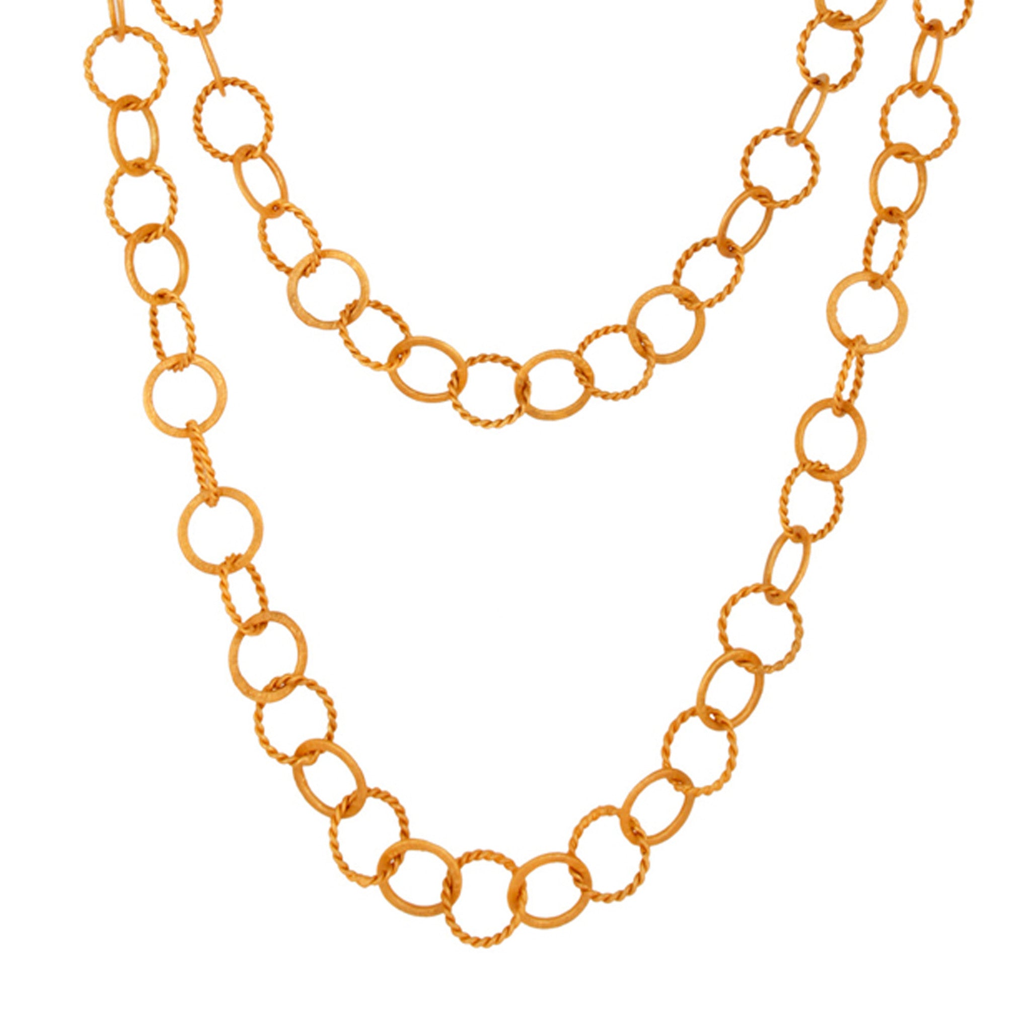 Classic chain of 24 karat gold plated brass is perfect for wearing long or layers easily with multiple necklaces. Can also be doubled over. Over adorn with multiple necklaces for old school Parisian flare.