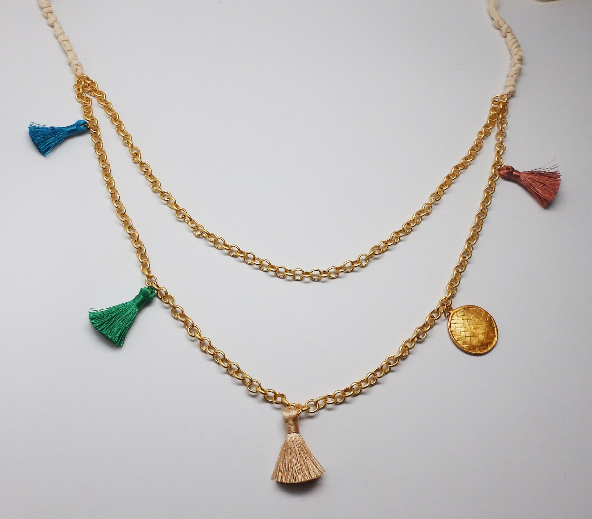 This charming versatile accent piece is hand-crafted from 18K gold plated chain, a signature Sam DuPont rattan medallion plated in 24k gold and and ensemble of silky cotton tassels from Nepal. Necklace is draped for a layering effect and strung on a free-form, hand-knotted chain of Japanese gauze. Necklace is fastened with a layered, adjustable bow tie. 109 cm long.