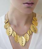 Feather-weight layered leaf necklace of 24 karat gold vermeil. Leaves are encrusted with semi precious stones of lapis, turquoise, and clear crystal and layered on 16" designer toggle clasp chain. Warm, reflective movement enhances the collarbone and lights up the face.