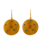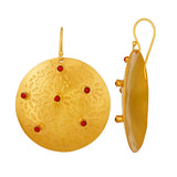 These 24K gold plated brass, Pan Asian-inspired, floral-etched medallion drop earrings are bezelled with organic semi-precious coral stones. Globally chic with heirloom quality. French hooks.