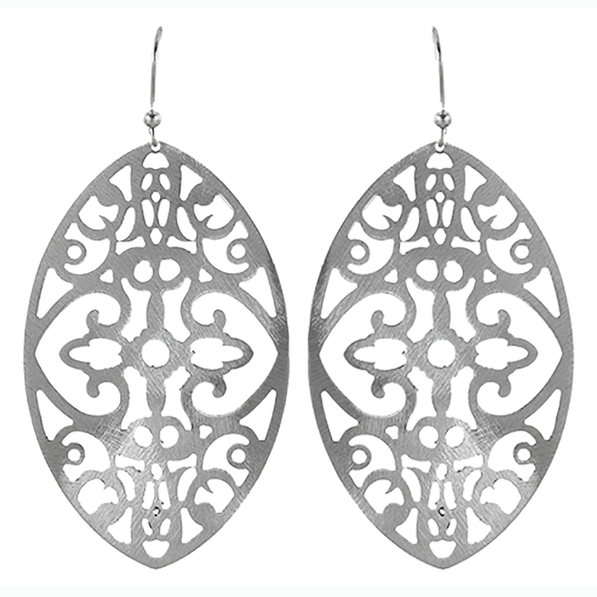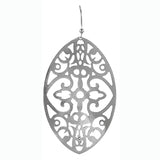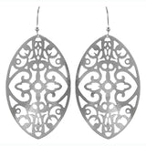 Large authentic filigree paisley ears are light weight and intricately hand carved by laser for statement ears that are clean and feminine. Carved from galvanized sterling silver, these artisan-orbs softly frame and illuminate the face. Articulated French hooks.