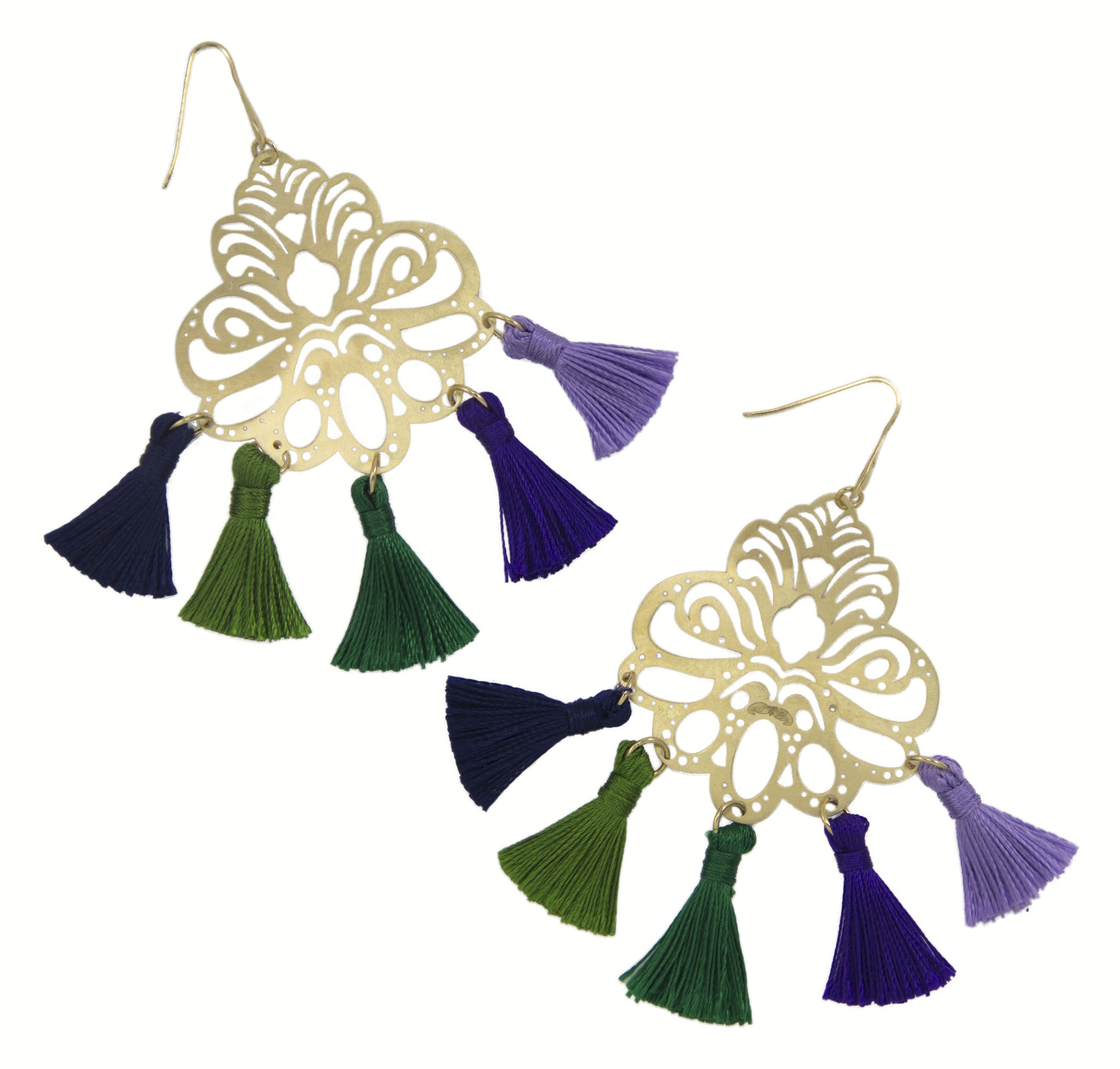 Inspired by the city of Arezzo in Tuscany, these chandeliers are laser cut by hand with intricate, filigree metal work. Light-weight chandeliers are adorned with and ensemble of Italian, jewel-toned silk tassels.