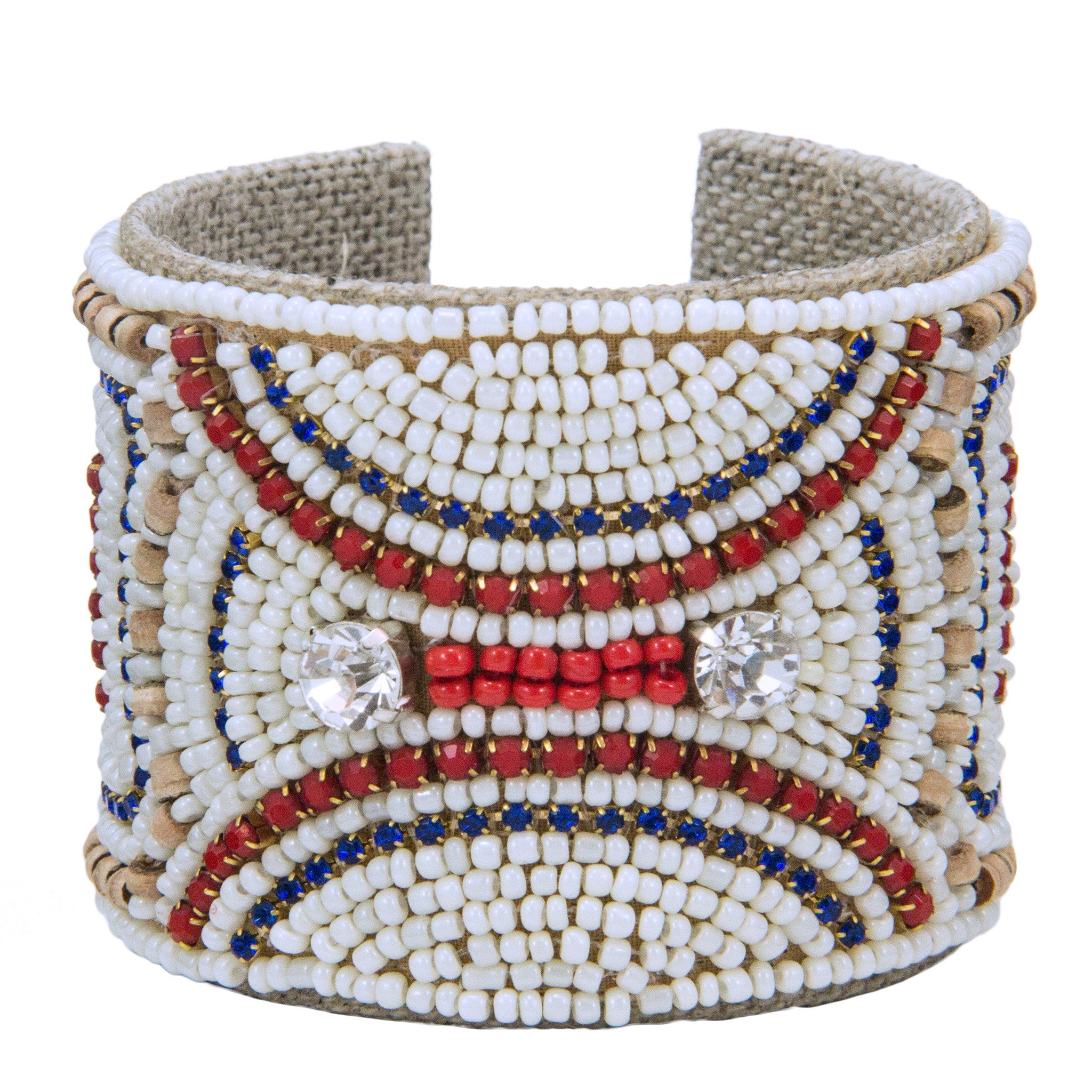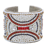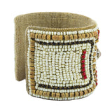 Handcrafted Devi Cuff by Sam DuPont. An adventurous statement piece of luminous color! Adorned with intricate patterns of colorful glass beads, all cuffs are pliable for an effortless and elegant fit. Natural linen lining adds style and comfort. Timeless color and styling.