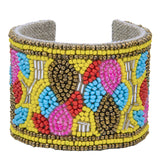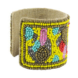 We love the unexpected pops of primary yellow with bronze, baby turq and bubblegum in our new confetti pattern. Signature hand-crafted Devi Cuff by Sam DuPont. An adventurous statement piece of luminous color! Adorned with intricate patterns of colorful glass beads, all cuffs are pliable for an effortless and elegant fit. Natural linen lining adds style and comfort. Pop a simple white shirt and jeans or add a flash of color to a simple sheath. Timeless color. Hand-Crafted in India. Ethical and sustainable production. 2"w x 7.25"l