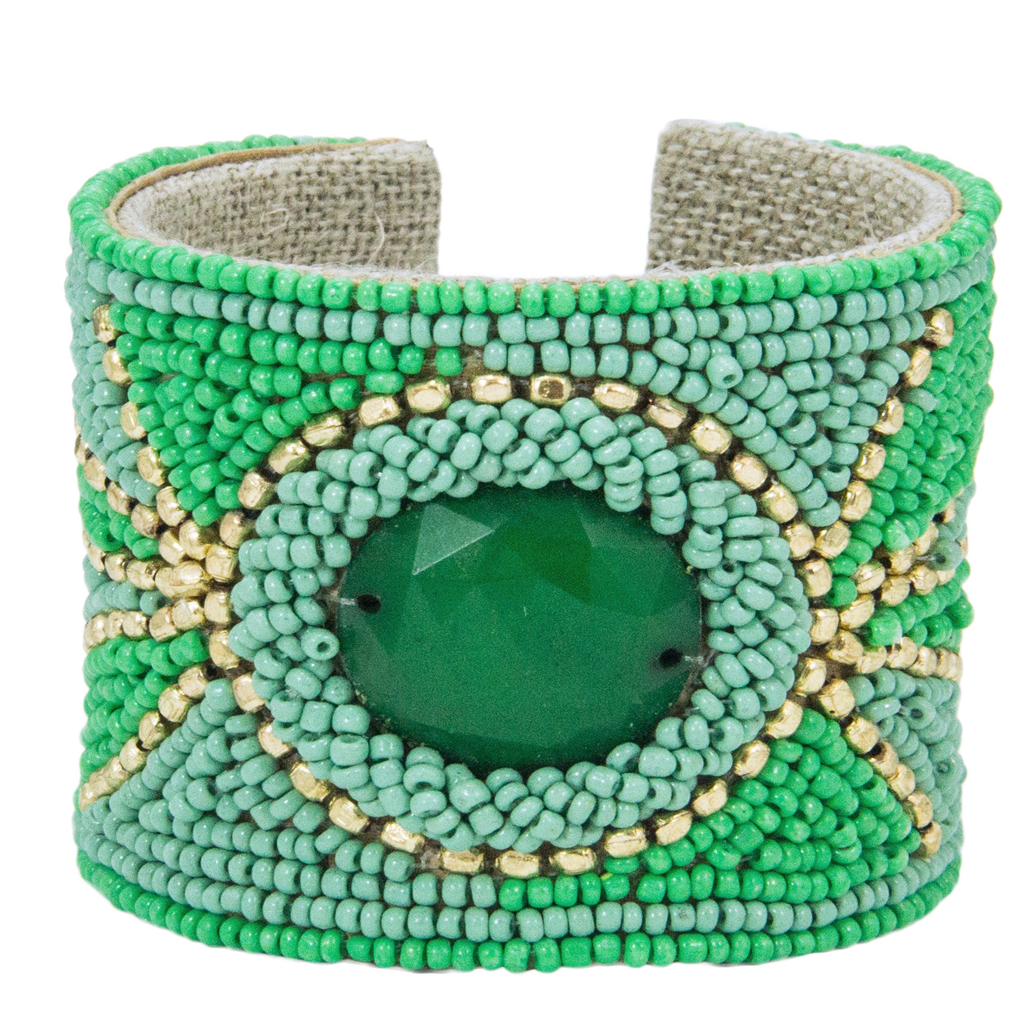 Shades of brilliant green with a gold contrast makes this cuff perfect for any occasion. This sundial pattern is exceptionally flattering on the wrist. Pop a simple white shirt and jeans or add a flash of color to a simple sheath.