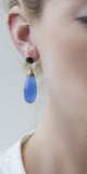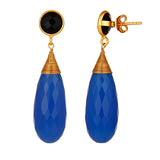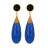 A marriage of sea and city, these highly reflective earrings project serious old Hollywood glamour. 24 karat gold vermeil wire embraces faceted jet crystal & the most perfect liberty blue chalcedony crystal-cut faceted drops that exude striking, heirloom quality.