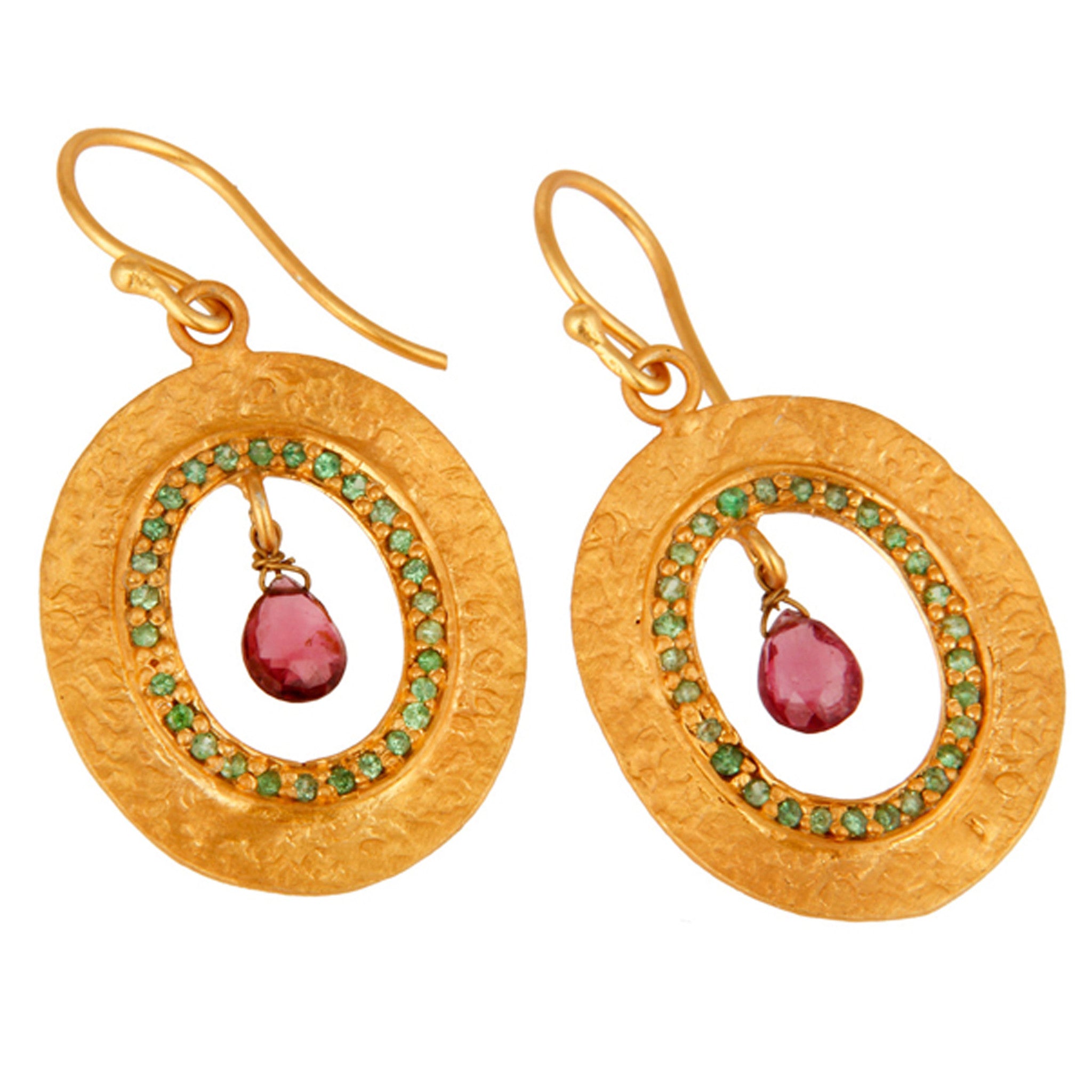 Solid ovals of sterling silver are brush plated in 24 karat Indian gold and encrusted with several highly reflective, bright green peridots. Dangling in the middle of the frame is a rose colored, roughly cut garnet. These earrings light up the face and have the feel & look of fine jewelry. Truly Exquisite.