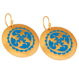Solid medallions of 24 karat gold plated brass is hand-enameled with an intricate swan pattern, reflective of Indian block print. French hooks. Globally sophistaced for every day wear.
