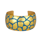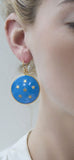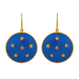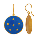 These 24 karat gold plated brass & enamel rounds are the perfect compliment to a day on the beach or a casual warm season evening. Pop of Bahama blue lifts the mood & lights up the face. Light weight, fresh & spirited. Hand-crafted in India.