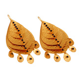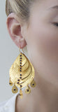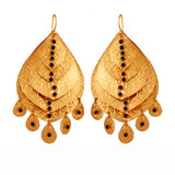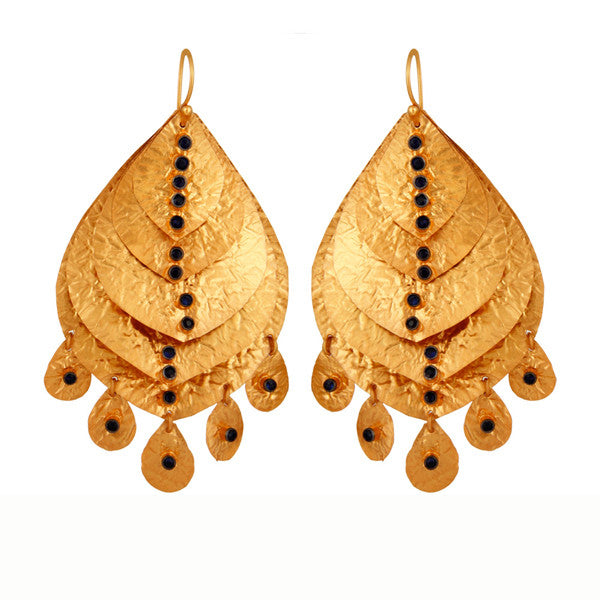 Exquisite, feather-weight chandeliers of 24 karat gold vermeil leaves are artfully bezelled with clusters of roughly cut semi-precious raw sapphires. These globally chic, statement earrings are the perfect accent to brighten up an evening cocktail party or equally elegant blowing in the ocean breeze with tousseled hair and a chic, sheer beach tunic. Warm, reflective movement lights up the face. French hooks.