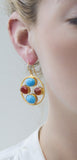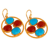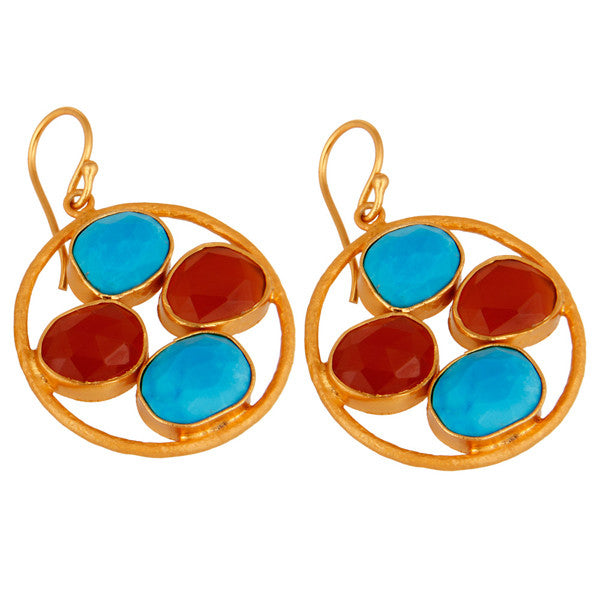 Hand-picked, rough-cut organic turquoise & carnelian are artfully bezelled inside two substantial rounds of hammered 24 karat gold vermeil. Medallion earrings hang from French hooks. Heirloom quality. Solid weight but not heavy on the ear. Stones may vary slightly in shape and color due to nature.