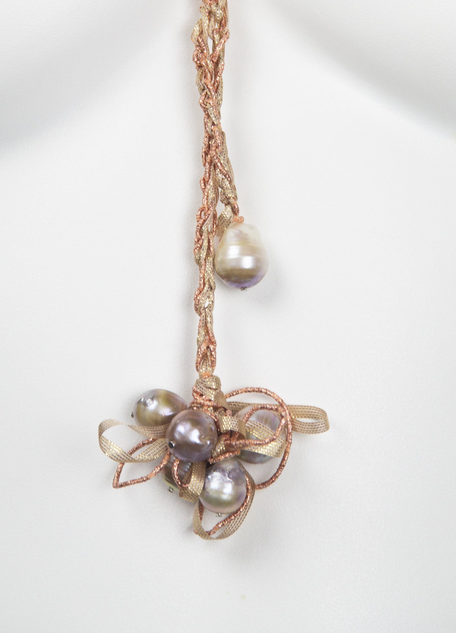 Boho-Chic, Japanese silk ribbons and lurex are artfully braided together to create this exquisite pearl lariat that can be worn open, tied or doubled over. One end is anchored with a hand-picked baroque pearly and the other with a bouquet of silvery pearly intertwined with free-form loops of silk ribbon. Allow 1-2 weeks for delivery. Custom colors for special occasions available upon request.