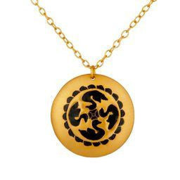 Solid Medallion of 24 karat gold plated brass is hand enameled with an intricate swan pattern reflective of Indian block print. Pendant hangs on 16" adjustable chain link necklace with toggle clasp. Globally sophistaced for every day wear.