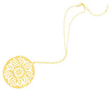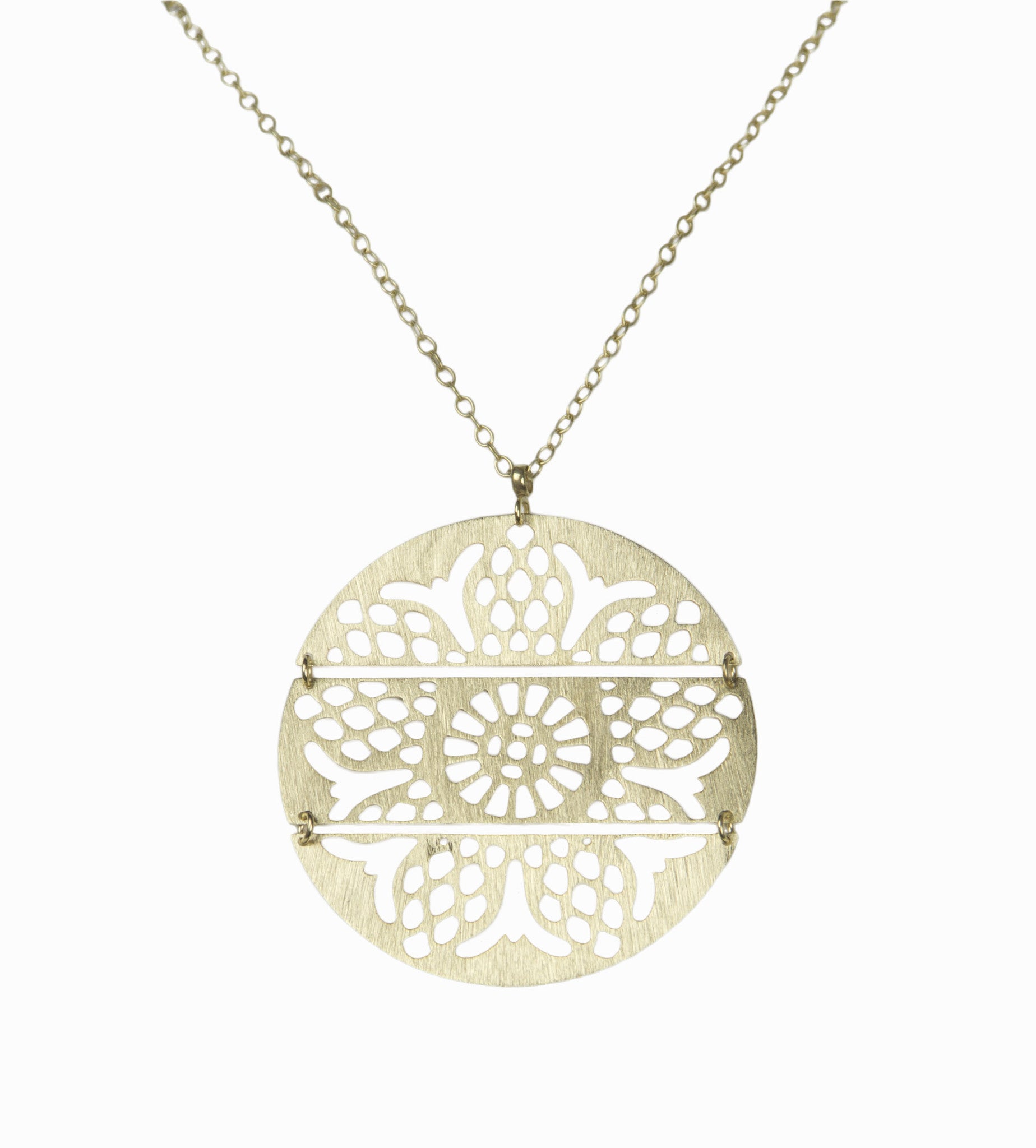 Crafted segments of laser cut galvanized metal are artfully linked together by hand to create a large round of filigree that is placed on a delicate, adjustable chain for unique glamour and modern movement. A signature pendant that offers newness and effortless posh..