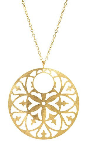 Galvanized Italian brassl is laser cut by hand to create this filigree round which is a perfect marriage between modern & ornate. This archectechtural embellishment is draped on a delicate, adjustable chain for perfect placement & movement. A unique and signature pendant thatis worthy of the runway.