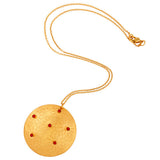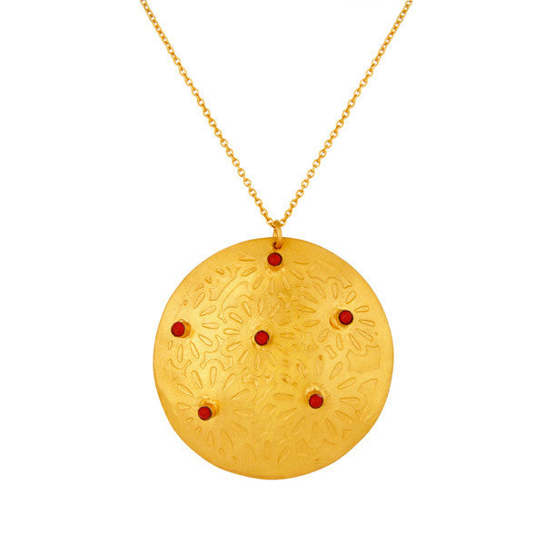 24 karat gold plated brass, Asian-inspired, floral-etched medallion is globally chic & light-weight. Medallion accented with organic semi-precious coral stones is set on a delicate 14" adjustable chain link short necklace. Gently accentuates the decollote' and can be casually worn alone or easily layered with mulitiple necklace lengths.