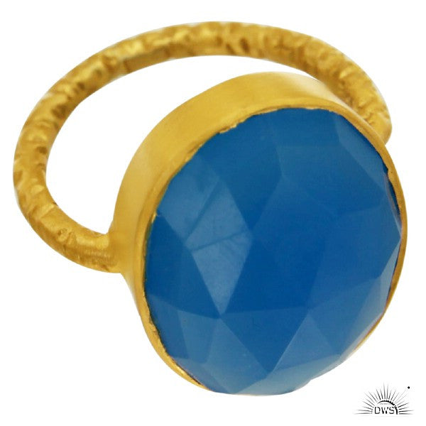 A half inch multi- faceted, highly reflective Deep Pool blue chalcedony is mounted in a 24 karat gold vermeil circular band. Stone color and shape may vary slightly due to natural quality of stone.