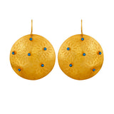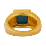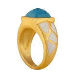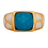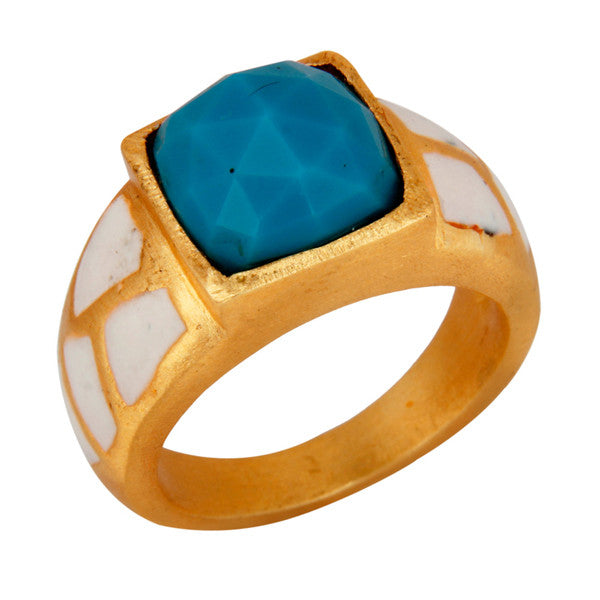 Deco-chic 24 karat gold plated brass ring is bezeled with a square multi-faceted deep blue turquoise. Stone is framed with geomtric accents of fresh white lacquer. Hand-crafted in India. Ethical & sustainable production. 0.30 oz sizes 5-8