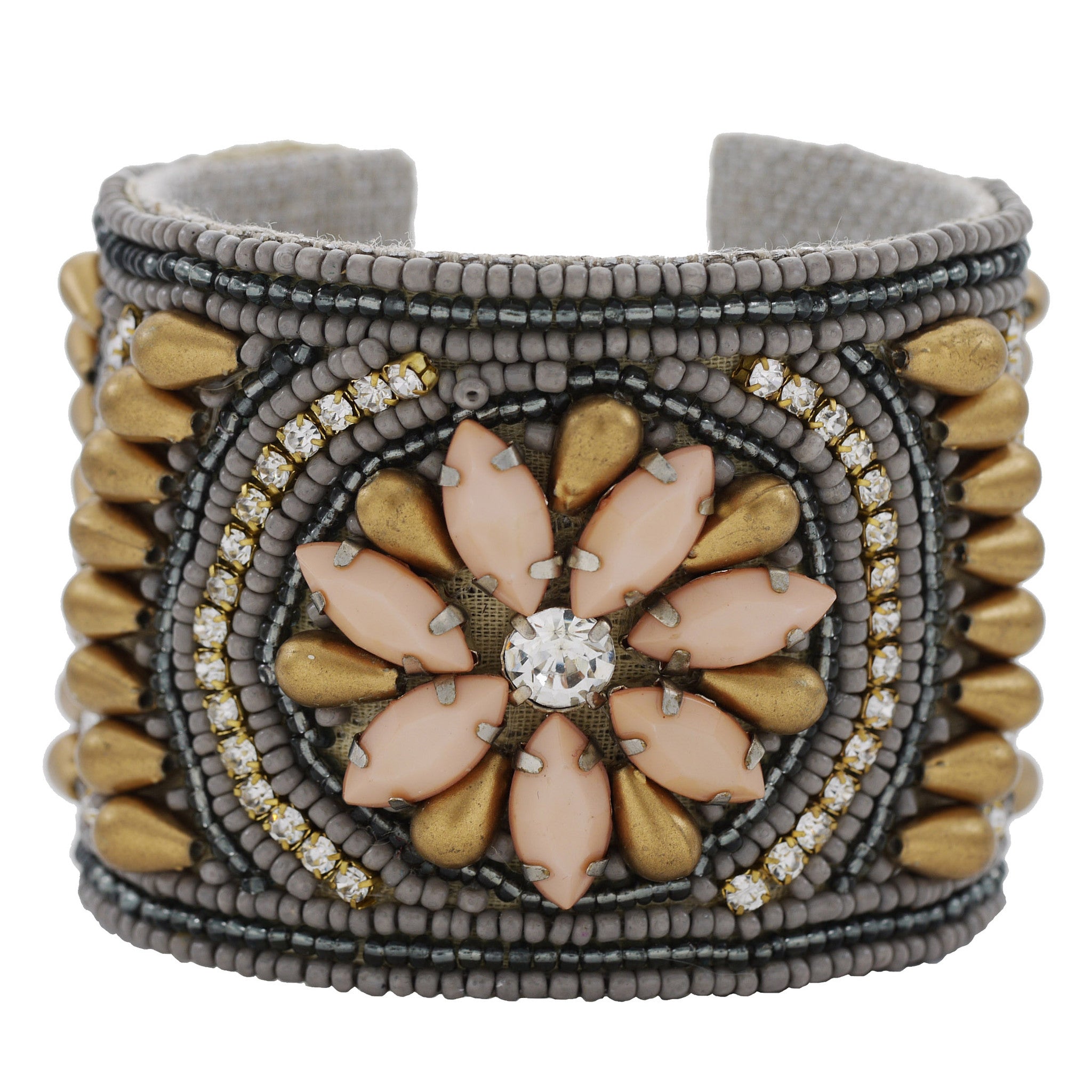 Inspired by the colors and designs of the Art Deco era, the Daisy cuff is an elegant statement piece that will dress up any outfit with its soft pink beads offset by modern metallics.