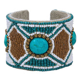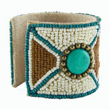 Our popular Hexi cuff is sophisticated southwestern-chic, combining iridescent bronze, teal and turq. Perfect with denim or soft, flowing cotton. Hand-crafted Devi Cuff by Sam DuPont. A perfect pop of luminous color. Sewn with intricate patterns of colorful glass & resin, all cuffs are flexible for an effortless and elegant fit. Signature natural linen lining adds organic stlyle and comfort.Compliment a simple white shirt & jeans or add a flash of color to a simple sheath or tunic. Timeless, affordable luxury.
