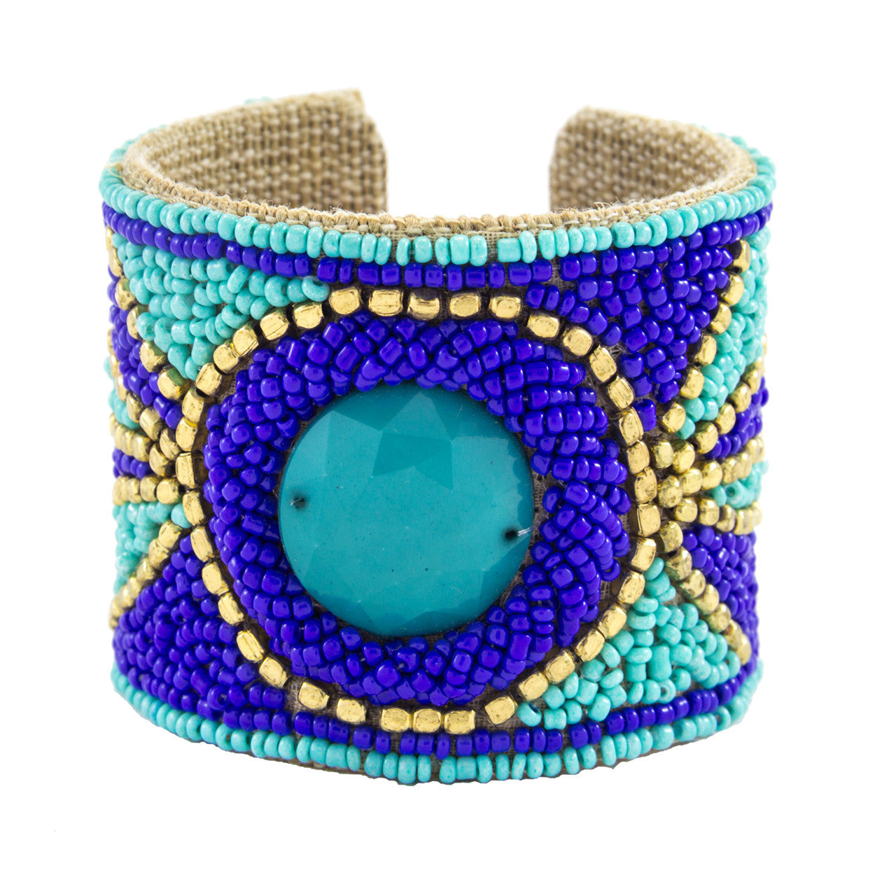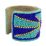 Signature hand-crafted Devi Cuff by Sam DuPont. An adventurous statement piece of luminous color! Adorned with intricate patterns of colorful glass beads, all cuffs are pliable for an effortless and elegant fit. Natural linen lining adds style and comfort. Timeless color.
