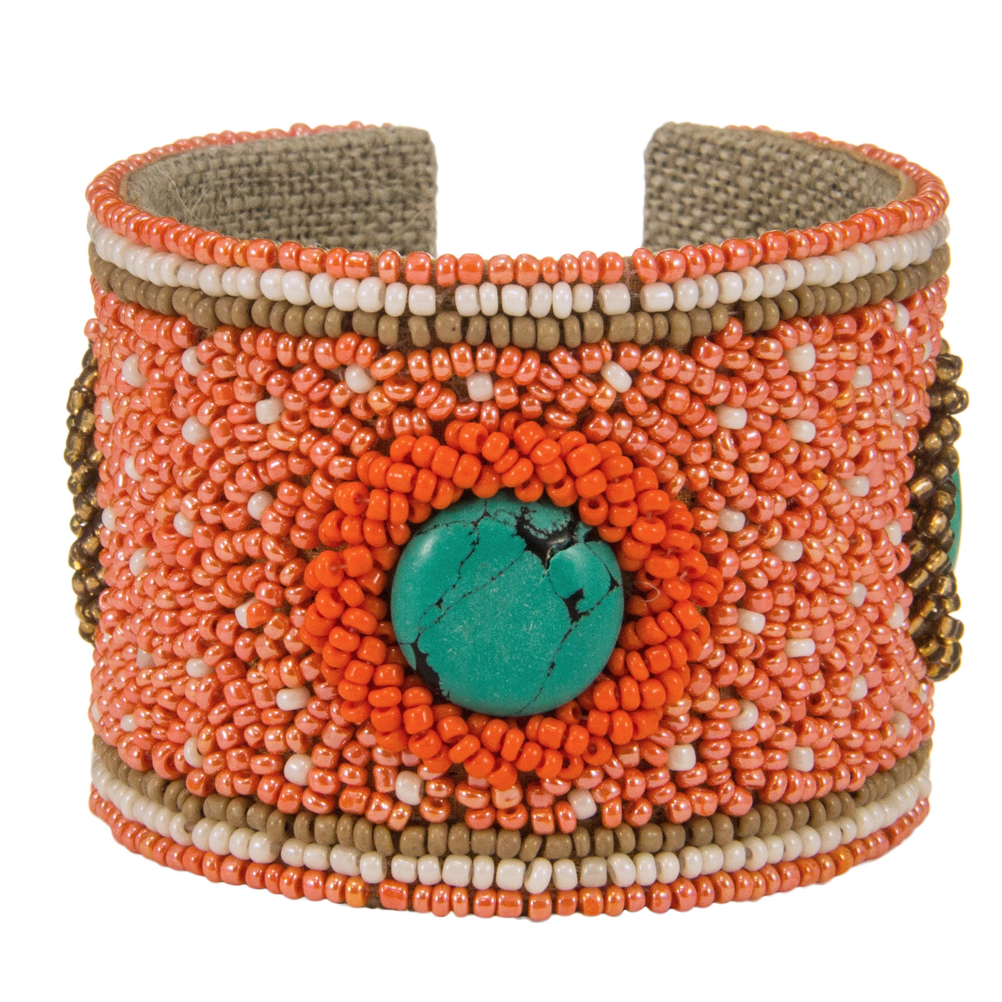 Signature hand-crafted Devi Cuff by Sam Dupont. An adventurous statement piece of luminous color! Adorned with intricate patterns of colorful glass beads, all cuffs are moldable for an effortless and elegant fit. Natural linen lining adds style and comfort. Pop a simple white shirt and jeans or add a flash of color to a simple sheath. Timeless color.