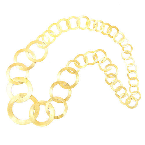 Graduated, seamless architectural links of galvanized brass are hand cut by laser and linked together to artfully drape the body for a modern look that makes a clean and modern statement.